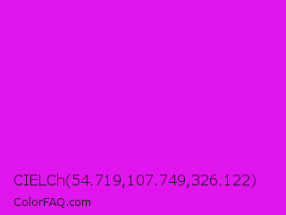 CIELCh 54.719,107.749,326.122 Color is a normal magenta color and the nearest color is Phlox #df00ff. Hex code #e115ed and RGB value is rgb(225,21,237). In RGB color space, this color is composed of 88% red, 8% green, 93% blue, In CMYK color space, this color is composed of 5% cyan, 91% magenta, 0% yellow , 7% black , In HSL color space, this color has a hue angle of 297° , 86% saturation and 51% lightness.