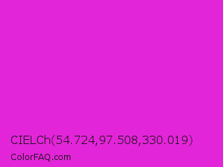 CIELCh 54.724,97.508,330.019 Color is a normal magenta color and the nearest color is Steel Pink #cc33cc. Hex code #e325d9 and RGB value is rgb(227,37,217). In RGB color space, this color is composed of 89% red, 15% green, 85% blue, In CMYK color space, this color is composed of 0% cyan, 84% magenta, 4% yellow , 11% black , In HSL color space, this color has a hue angle of 303° , 77% saturation and 52% lightness.