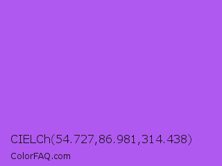 CIELCh 54.727,86.981,314.438 Color is a light purple color and the nearest color is Navy Purple #9457eb. Hex code #b059f0 and RGB value is rgb(176,89,240). In RGB color space, this color is composed of 69% red, 35% green, 94% blue, In CMYK color space, this color is composed of 27% cyan, 63% magenta, 0% yellow , 6% black , In HSL color space, this color has a hue angle of 275° , 83% saturation and 65% lightness.