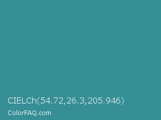 CIELCh 54.72,26.3,205.946 Color is a normal cyan color and the nearest color is Astral #327da0. Hex code #378f96 and RGB value is rgb(55,143,150). In RGB color space, this color is composed of 22% red, 56% green, 59% blue, In CMYK color space, this color is composed of 63% cyan, 5% magenta, 0% yellow , 41% black , In HSL color space, this color has a hue angle of 184° , 46% saturation and 40% lightness.