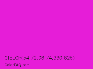 CIELCh 54.72,98.74,330.826 Color is a normal magenta color and the nearest color is Hot Magenta #ff1dce. Hex code #e61dd8 and RGB value is rgb(230,29,216). In RGB color space, this color is composed of 90% red, 11% green, 85% blue, In CMYK color space, this color is composed of 0% cyan, 87% magenta, 6% yellow , 10% black , In HSL color space, this color has a hue angle of 304° , 80% saturation and 51% lightness.