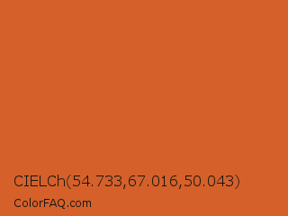 CIELCh 54.733,67.016,50.043 Color is a normal orange color and the nearest color is Vivid Red Tangelo #df6124. Hex code #d56029 and RGB value is rgb(213,96,41). In RGB color space, this color is composed of 84% red, 38% green, 16% blue, In CMYK color space, this color is composed of 0% cyan, 55% magenta, 81% yellow , 16% black , In HSL color space, this color has a hue angle of 19° , 68% saturation and 50% lightness.