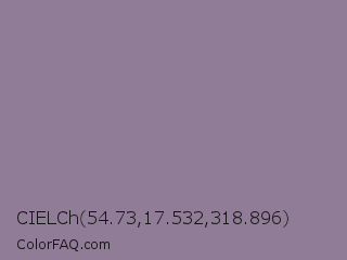 CIELCh 54.73,17.532,318.896 Color is a normal purple color and the nearest color is Mamba #8e8190. Hex code #917c97 and RGB value is rgb(145,124,151). In RGB color space, this color is composed of 57% red, 49% green, 59% blue, In CMYK color space, this color is composed of 4% cyan, 18% magenta, 0% yellow , 41% black , In HSL color space, this color has a hue angle of 287° , 11% saturation and 54% lightness.