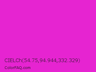 CIELCh 54.75,94.944,332.329 Color is a normal magenta color and the nearest color is Hot Magenta #ff1dce. Hex code #e624d1 and RGB value is rgb(230,36,209). In RGB color space, this color is composed of 90% red, 14% green, 82% blue, In CMYK color space, this color is composed of 0% cyan, 84% magenta, 9% yellow , 10% black , In HSL color space, this color has a hue angle of 306° , 80% saturation and 52% lightness.