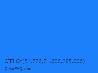CIELCh 54.776,71.606,285.006 Color is a normal blue color and the nearest color is Blue Crayola #1f75fe. Hex code #1c80fc and RGB value is rgb(28,128,252). In RGB color space, this color is composed of 11% red, 50% green, 99% blue, In CMYK color space, this color is composed of 89% cyan, 49% magenta, 0% yellow , 1% black , In HSL color space, this color has a hue angle of 213° , 97% saturation and 55% lightness.