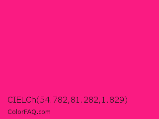CIELCh 54.782,81.282,1.829 Color is a normal rose color and the nearest color is Fluorescent Pink #ff1493. Hex code #fa1b82 and RGB value is rgb(250,27,130). In RGB color space, this color is composed of 98% red, 11% green, 51% blue, In CMYK color space, this color is composed of 0% cyan, 89% magenta, 48% yellow , 2% black , In HSL color space, this color has a hue angle of 332° , 96% saturation and 54% lightness.