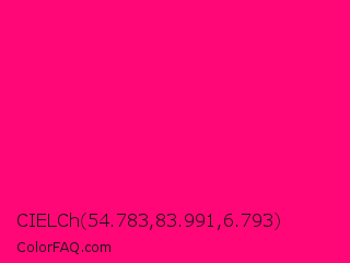 CIELCh 54.783,83.991,6.793 Color is a normal rose color and the nearest color is Winter Sky #ff007c. Hex code #ff0776 and RGB value is rgb(255,7,118). In RGB color space, this color is composed of 100% red, 3% green, 46% blue, In CMYK color space, this color is composed of 0% cyan, 97% magenta, 54% yellow , 0% black , In HSL color space, this color has a hue angle of 333° , 100% saturation and 51% lightness.