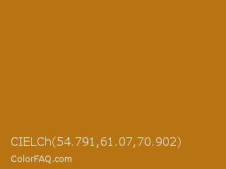 CIELCh 54.791,61.07,70.902 Color is a normal orange color and the nearest color is Bourbon #ba6f1e. Hex code #b87413 and RGB value is rgb(184,116,19). In RGB color space, this color is composed of 72% red, 45% green, 7% blue, In CMYK color space, this color is composed of 0% cyan, 37% magenta, 90% yellow , 28% black , In HSL color space, this color has a hue angle of 35° , 81% saturation and 40% lightness.