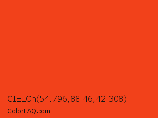 CIELCh 54.796,88.46,42.308 Color is a normal red color and the nearest color is Pomegranate #f34723. Hex code #f2411a and RGB value is rgb(242,65,26). In RGB color space, this color is composed of 95% red, 25% green, 10% blue, In CMYK color space, this color is composed of 0% cyan, 73% magenta, 89% yellow , 5% black , In HSL color space, this color has a hue angle of 11° , 89% saturation and 53% lightness.