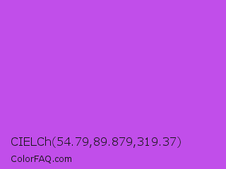 CIELCh 54.79,89.879,319.37 Color is a light purple color and the nearest color is Medium Orchid #ba55d3. Hex code #c14eea and RGB value is rgb(193,78,234). In RGB color space, this color is composed of 76% red, 31% green, 92% blue, In CMYK color space, this color is composed of 18% cyan, 67% magenta, 0% yellow , 8% black , In HSL color space, this color has a hue angle of 284° , 79% saturation and 61% lightness.