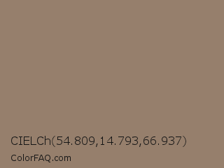 CIELCh 54.809,14.793,66.937 Color is a normal orange color and the nearest color is Almond Frost #907b71. Hex code #967f6c and RGB value is rgb(150,127,108). In RGB color space, this color is composed of 59% red, 50% green, 42% blue, In CMYK color space, this color is composed of 0% cyan, 15% magenta, 28% yellow , 41% black , In HSL color space, this color has a hue angle of 27° , 17% saturation and 51% lightness.