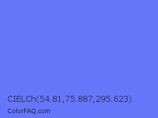 CIELCh 54.81,75.887,295.623 Color is a light blue color and the nearest color is Very Light Blue #6666ff. Hex code #6676fb and RGB value is rgb(102,118,251). In RGB color space, this color is composed of 40% red, 46% green, 98% blue, In CMYK color space, this color is composed of 59% cyan, 53% magenta, 0% yellow , 2% black , In HSL color space, this color has a hue angle of 234° , 95% saturation and 69% lightness.