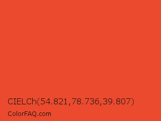 CIELCh 54.821,78.736,39.807 Color is a normal red color and the nearest color is Cinnabar #e34234. Hex code #eb4a2e and RGB value is rgb(235,74,46). In RGB color space, this color is composed of 92% red, 29% green, 18% blue, In CMYK color space, this color is composed of 0% cyan, 69% magenta, 80% yellow , 8% black , In HSL color space, this color has a hue angle of 9° , 83% saturation and 55% lightness.
