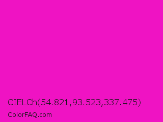 CIELCh 54.821,93.523,337.475 Color is a normal magenta color and the nearest color is Shocking Pink #fc0fc0. Hex code #ef13c3 and RGB value is rgb(239,19,195). In RGB color space, this color is composed of 94% red, 7% green, 76% blue, In CMYK color space, this color is composed of 0% cyan, 92% magenta, 18% yellow , 6% black , In HSL color space, this color has a hue angle of 312° , 87% saturation and 51% lightness.