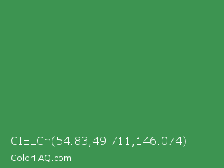 CIELCh 54.83,49.711,146.074 Color is a normal green color and the nearest color is Sea Green #2e8b57. Hex code #3d9451 and RGB value is rgb(61,148,81). In RGB color space, this color is composed of 24% red, 58% green, 32% blue, In CMYK color space, this color is composed of 59% cyan, 0% magenta, 45% yellow , 42% black , In HSL color space, this color has a hue angle of 134° , 42% saturation and 41% lightness.