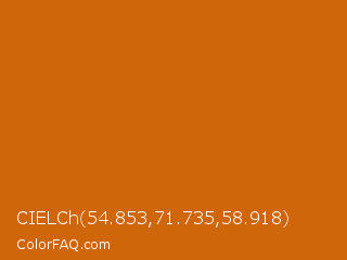 CIELCh 54.853,71.735,58.918 Color is a normal orange color and the nearest color is Red Stage #d05f04. Hex code #cf6609 and RGB value is rgb(207,102,9). In RGB color space, this color is composed of 81% red, 40% green, 4% blue, In CMYK color space, this color is composed of 0% cyan, 51% magenta, 96% yellow , 19% black , In HSL color space, this color has a hue angle of 28° , 92% saturation and 42% lightness.
