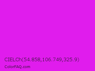 CIELCh 54.858,106.749,325.9 Color is a normal magenta color and the nearest color is Phlox #df00ff. Hex code #e01ced and RGB value is rgb(224,28,237). In RGB color space, this color is composed of 88% red, 11% green, 93% blue, In CMYK color space, this color is composed of 5% cyan, 88% magenta, 0% yellow , 7% black , In HSL color space, this color has a hue angle of 296° , 85% saturation and 52% lightness.