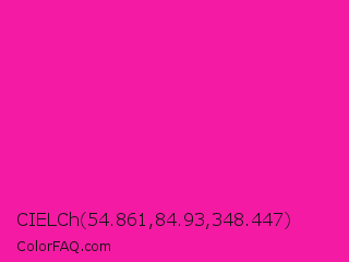 CIELCh 54.861,84.93,348.447 Color is a normal magenta color and the nearest color is Persian Rose #fe28a2. Hex code #f51aa3 and RGB value is rgb(245,26,163). In RGB color space, this color is composed of 96% red, 10% green, 64% blue, In CMYK color space, this color is composed of 0% cyan, 89% magenta, 33% yellow , 4% black , In HSL color space, this color has a hue angle of 322° , 92% saturation and 53% lightness.