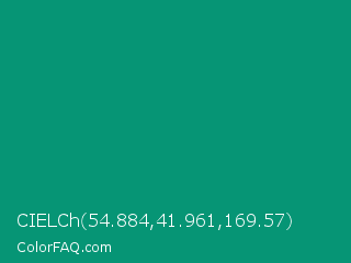 CIELCh 54.884,41.961,169.57 Color is a dark cyan color and the nearest color is Paolo Veronese Green #009b7d. Hex code #069575 and RGB value is rgb(6,149,117). In RGB color space, this color is composed of 2% red, 58% green, 46% blue, In CMYK color space, this color is composed of 96% cyan, 0% magenta, 21% yellow , 42% black , In HSL color space, this color has a hue angle of 167° , 92% saturation and 30% lightness.