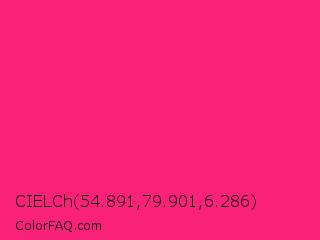 CIELCh 54.891,79.901,6.286 Color is a normal rose color and the nearest color is Razzmatazz #e3256b. Hex code #fa2278 and RGB value is rgb(250,34,120). In RGB color space, this color is composed of 98% red, 13% green, 47% blue, In CMYK color space, this color is composed of 0% cyan, 86% magenta, 52% yellow , 2% black , In HSL color space, this color has a hue angle of 336° , 96% saturation and 56% lightness.