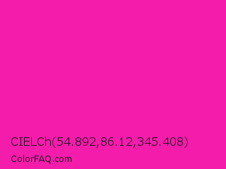 CIELCh 54.892,86.12,345.408 Color is a normal magenta color and the nearest color is Persian Rose #fe28a2. Hex code #f31cab and RGB value is rgb(243,28,171). In RGB color space, this color is composed of 95% red, 11% green, 67% blue, In CMYK color space, this color is composed of 0% cyan, 88% magenta, 30% yellow , 5% black , In HSL color space, this color has a hue angle of 320° , 90% saturation and 53% lightness.