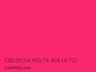 CIELCh 54.903,79.404,10.72 Color is a normal rose color and the nearest color is Radical Red #ff355e. Hex code #fa266e and RGB value is rgb(250,38,110). In RGB color space, this color is composed of 98% red, 15% green, 43% blue, In CMYK color space, this color is composed of 0% cyan, 85% magenta, 56% yellow , 2% black , In HSL color space, this color has a hue angle of 340° , 95% saturation and 56% lightness.
