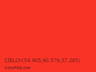 CIELCh 54.905,90.579,37.265 Color is a normal red color and the nearest color is Red Orange #ff3f34. Hex code #fa3327 and RGB value is rgb(250,51,39). In RGB color space, this color is composed of 98% red, 20% green, 15% blue, In CMYK color space, this color is composed of 0% cyan, 80% magenta, 84% yellow , 2% black , In HSL color space, this color has a hue angle of 3° , 95% saturation and 57% lightness.