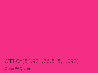 CIELCh 54.921,76.515,1.092 Color is a normal rose color and the nearest color is Cerise Pink #ec3b83. Hex code #f42e84 and RGB value is rgb(244,46,132). In RGB color space, this color is composed of 96% red, 18% green, 52% blue, In CMYK color space, this color is composed of 0% cyan, 81% magenta, 46% yellow , 4% black , In HSL color space, this color has a hue angle of 334° , 90% saturation and 57% lightness.