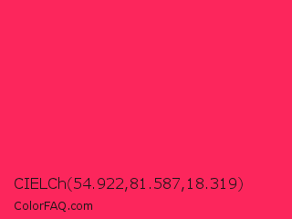 CIELCh 54.922,81.587,18.319 Color is a normal red color and the nearest color is Awesome #ff2052. Hex code #fc265c and RGB value is rgb(252,38,92). In RGB color space, this color is composed of 99% red, 15% green, 36% blue, In CMYK color space, this color is composed of 0% cyan, 85% magenta, 63% yellow , 1% black , In HSL color space, this color has a hue angle of 345° , 97% saturation and 57% lightness.