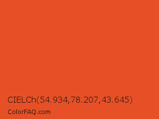 CIELCh 54.934,78.207,43.645 Color is a normal red color and the nearest color is Flame #e25822. Hex code #e75026 and RGB value is rgb(231,80,38). In RGB color space, this color is composed of 91% red, 31% green, 15% blue, In CMYK color space, this color is composed of 0% cyan, 65% magenta, 84% yellow , 9% black , In HSL color space, this color has a hue angle of 13° , 80% saturation and 53% lightness.