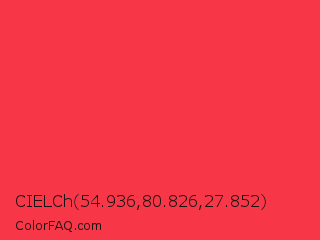 CIELCh 54.936,80.826,27.852 Color is a normal red color and the nearest color is Red Salsa #fd3a4a. Hex code #f73647 and RGB value is rgb(247,54,71). In RGB color space, this color is composed of 97% red, 21% green, 28% blue, In CMYK color space, this color is composed of 0% cyan, 78% magenta, 71% yellow , 3% black , In HSL color space, this color has a hue angle of 355° , 92% saturation and 59% lightness.