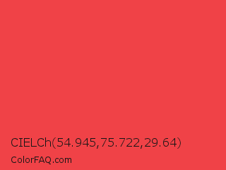 CIELCh 54.945,75.722,29.64 Color is a normal red color and the nearest color is Carmine Pink #eb4c42. Hex code #f04247 and RGB value is rgb(240,66,71). In RGB color space, this color is composed of 94% red, 26% green, 28% blue, In CMYK color space, this color is composed of 0% cyan, 73% magenta, 70% yellow , 6% black , In HSL color space, this color has a hue angle of 358° , 85% saturation and 60% lightness.