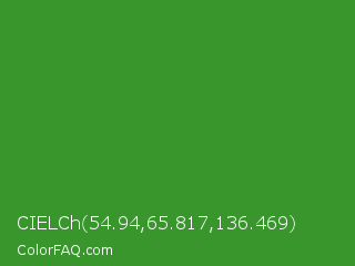 CIELCh 54.94,65.817,136.469 Color is a normal green color and the nearest color is Slimy Green #299617. Hex code #39962d and RGB value is rgb(57,150,45). In RGB color space, this color is composed of 22% red, 59% green, 18% blue, In CMYK color space, this color is composed of 62% cyan, 0% magenta, 70% yellow , 41% black , In HSL color space, this color has a hue angle of 113° , 54% saturation and 38% lightness.