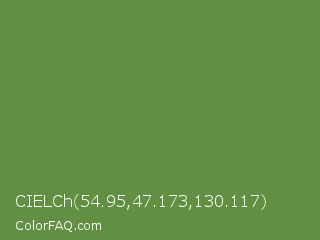 CIELCh 54.95,47.173,130.117 Color is a normal green color and the nearest color is Palm Leaf #6f9940. Hex code #619042 and RGB value is rgb(97,144,66). In RGB color space, this color is composed of 38% red, 56% green, 26% blue, In CMYK color space, this color is composed of 33% cyan, 0% magenta, 54% yellow , 44% black , In HSL color space, this color has a hue angle of 96° , 37% saturation and 41% lightness.