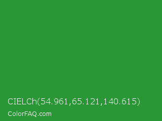 CIELCh 54.961,65.121,140.615 Color is a normal green color and the nearest color is Forest Green #228b22. Hex code #2a9736 and RGB value is rgb(42,151,54). In RGB color space, this color is composed of 16% red, 59% green, 21% blue, In CMYK color space, this color is composed of 72% cyan, 0% magenta, 64% yellow , 41% black , In HSL color space, this color has a hue angle of 127° , 56% saturation and 38% lightness.