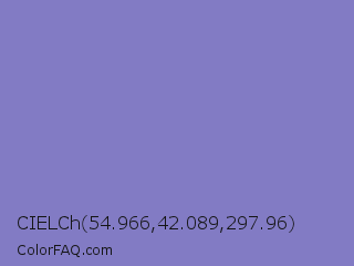 CIELCh 54.966,42.089,297.96 Color is a light indigo color and the nearest color is Ube #8878c3. Hex code #827bc4 and RGB value is rgb(130,123,196). In RGB color space, this color is composed of 51% red, 48% green, 77% blue, In CMYK color space, this color is composed of 34% cyan, 37% magenta, 0% yellow , 23% black , In HSL color space, this color has a hue angle of 246° , 38% saturation and 63% lightness.