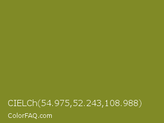 CIELCh 54.975,52.243,108.988 Color is a normal yellow color and the nearest color is Wasabi #788a25. Hex code #808a26 and RGB value is rgb(128,138,38). In RGB color space, this color is composed of 50% red, 54% green, 15% blue, In CMYK color space, this color is composed of 7% cyan, 0% magenta, 72% yellow , 46% black , In HSL color space, this color has a hue angle of 66° , 57% saturation and 35% lightness.