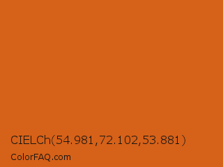 CIELCh 54.981,72.102,53.881 Color is a normal orange color and the nearest color is Hot Cinnamon #d2691e. Hex code #d66118 and RGB value is rgb(214,97,24). In RGB color space, this color is composed of 84% red, 38% green, 9% blue, In CMYK color space, this color is composed of 0% cyan, 55% magenta, 89% yellow , 16% black , In HSL color space, this color has a hue angle of 23° , 80% saturation and 47% lightness.