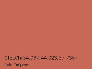 CIELCh 54.987,44.923,37.736 Color is a normal red color and the nearest color is Copper Red #cb6d51. Hex code #c76956 and RGB value is rgb(199,105,86). In RGB color space, this color is composed of 78% red, 41% green, 34% blue, In CMYK color space, this color is composed of 0% cyan, 47% magenta, 57% yellow , 22% black , In HSL color space, this color has a hue angle of 10° , 50% saturation and 56% lightness.