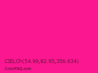 CIELCh 54.99,82.95,356.634 Color is a normal rose color and the nearest color is Fluorescent Pink #ff1493. Hex code #fa178f and RGB value is rgb(250,23,143). In RGB color space, this color is composed of 98% red, 9% green, 56% blue, In CMYK color space, this color is composed of 0% cyan, 91% magenta, 43% yellow , 2% black , In HSL color space, this color has a hue angle of 328° , 96% saturation and 54% lightness.