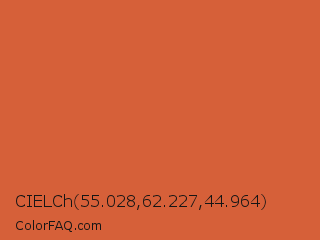 CIELCh 55.028,62.227,44.964 Color is a normal color and the nearest color is Medium Vermilion #d9603b. Hex code #d66039 and RGB value is rgb(214,96,57). In RGB color space, this color is composed of 84% red, 38% green, 22% blue, In CMYK color space, this color is composed of 0% cyan, 55% magenta, 73% yellow , 16% black , In HSL color space, this color has a hue angle of 15° , 66% saturation and 53% lightness.