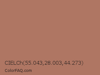 CIELCh 55.043,28.003,44.273 Color is a normal color and the nearest color is Copper Penny #ad6f69. Hex code #af7663 and RGB value is rgb(175,118,99). In RGB color space, this color is composed of 69% red, 46% green, 39% blue, In CMYK color space, this color is composed of 0% cyan, 33% magenta, 43% yellow , 31% black , In HSL color space, this color has a hue angle of 15° , 32% saturation and 54% lightness.