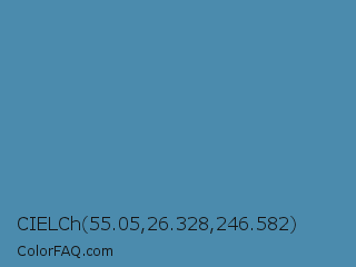 CIELCh 55.05,26.328,246.582 Color is a normal blue color and the nearest color is Cyan Azure #4e82b4. Hex code #4b8bad and RGB value is rgb(75,139,173). In RGB color space, this color is composed of 29% red, 55% green, 68% blue, In CMYK color space, this color is composed of 57% cyan, 20% magenta, 0% yellow , 32% black , In HSL color space, this color has a hue angle of 201° , 40% saturation and 49% lightness.