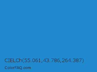 CIELCh 55.061,43.786,264.387 Color is a normal blue color and the nearest color is Curious Blue #2596d1. Hex code #208acf and RGB value is rgb(32,138,207). In RGB color space, this color is composed of 13% red, 54% green, 81% blue, In CMYK color space, this color is composed of 85% cyan, 33% magenta, 0% yellow , 19% black , In HSL color space, this color has a hue angle of 204° , 73% saturation and 47% lightness.