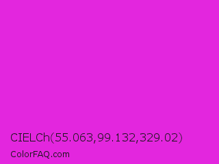 CIELCh 55.063,99.132,329.02 Color is a normal magenta color and the nearest color is Steel Pink #cc33cc. Hex code #e326de and RGB value is rgb(227,38,222). In RGB color space, this color is composed of 89% red, 15% green, 87% blue, In CMYK color space, this color is composed of 0% cyan, 83% magenta, 2% yellow , 11% black , In HSL color space, this color has a hue angle of 302° , 77% saturation and 52% lightness.