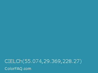CIELCh 55.074,29.369,228.27 Color is a normal cyan color and the nearest color is Eastern Blue #1e9ab0. Hex code #2a8fa9 and RGB value is rgb(42,143,169). In RGB color space, this color is composed of 16% red, 56% green, 66% blue, In CMYK color space, this color is composed of 75% cyan, 15% magenta, 0% yellow , 34% black , In HSL color space, this color has a hue angle of 192° , 60% saturation and 41% lightness.