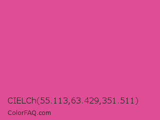 CIELCh 55.113,63.429,351.511 Color is a normal rose color and the nearest color is Raspberry Pink #e25098. Hex code #de4d96 and RGB value is rgb(222,77,150). In RGB color space, this color is composed of 87% red, 30% green, 59% blue, In CMYK color space, this color is composed of 0% cyan, 65% magenta, 32% yellow , 13% black , In HSL color space, this color has a hue angle of 330° , 69% saturation and 59% lightness.