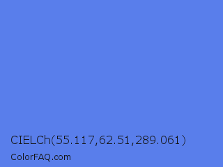 CIELCh 55.117,62.51,289.061 Color is a light blue color and the nearest color is Blueberry #4f86f7. Hex code #597eeb and RGB value is rgb(89,126,235). In RGB color space, this color is composed of 35% red, 49% green, 92% blue, In CMYK color space, this color is composed of 62% cyan, 46% magenta, 0% yellow , 8% black , In HSL color space, this color has a hue angle of 225° , 78% saturation and 64% lightness.
