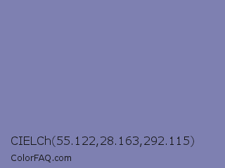 CIELCh 55.122,28.163,292.115 Color is a normal blue color and the nearest color is Wild Blue Yonder #7a89b8. Hex code #7e80b1 and RGB value is rgb(126,128,177). In RGB color space, this color is composed of 49% red, 50% green, 69% blue, In CMYK color space, this color is composed of 29% cyan, 28% magenta, 0% yellow , 31% black , In HSL color space, this color has a hue angle of 238° , 25% saturation and 59% lightness.