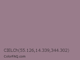 CIELCh 55.126,14.339,344.302 Color is a normal rose color and the nearest color is Mountbatten Pink #997a8d. Hex code #997c8b and RGB value is rgb(153,124,139). In RGB color space, this color is composed of 60% red, 49% green, 55% blue, In CMYK color space, this color is composed of 0% cyan, 19% magenta, 9% yellow , 40% black , In HSL color space, this color has a hue angle of 329° , 12% saturation and 54% lightness.